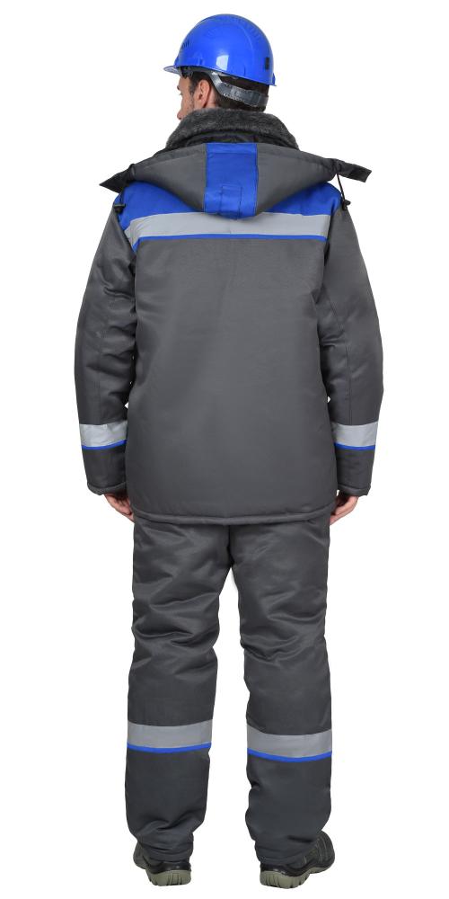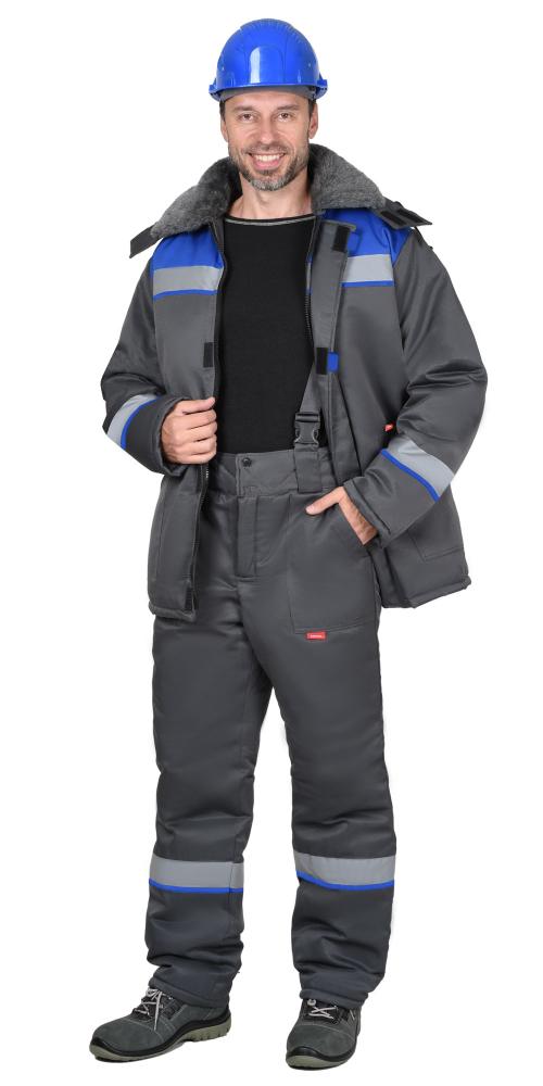 Куртка прямого силуэта с прокладкой из ветрозащитной ткани, с воротником стойка, с центральной застёжкой на тесьму-«молния» накрытую ветрозащитной планкой, застёгивающимся на одну кнопку и 4 липучки, с подрезными бочками, с верхними фигурными карманами и фигурными клапанами на липучках, с нижними карманами в рельефах, с притачным поясом частично стянутый на резинку ткацкую. Рукава с притачными манжетами частично стянутые на резинку ткацкую. В куртке предусмотрена фигурная лента светоотражающая 50 мм. для обозначения сигнальной видимости.Полукомбинезон прямой, с притачной утепленной подкладкой, с центральной застежкой на тесьму – «молния» накрытая планкой застегивающиеся на липучку, с нагрудными накладными карманами, с нижними внутренними карманами с наклонным входом, с накладным карманом и фигурным клапаном застёгивающийся на липучку на боковом шве, с задними накладными карманами и карманами под инструменты, с резинкой ткацкой в области спины, с наколенниками. Бретели регулируются помочной резинкой и фастексам.