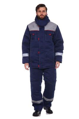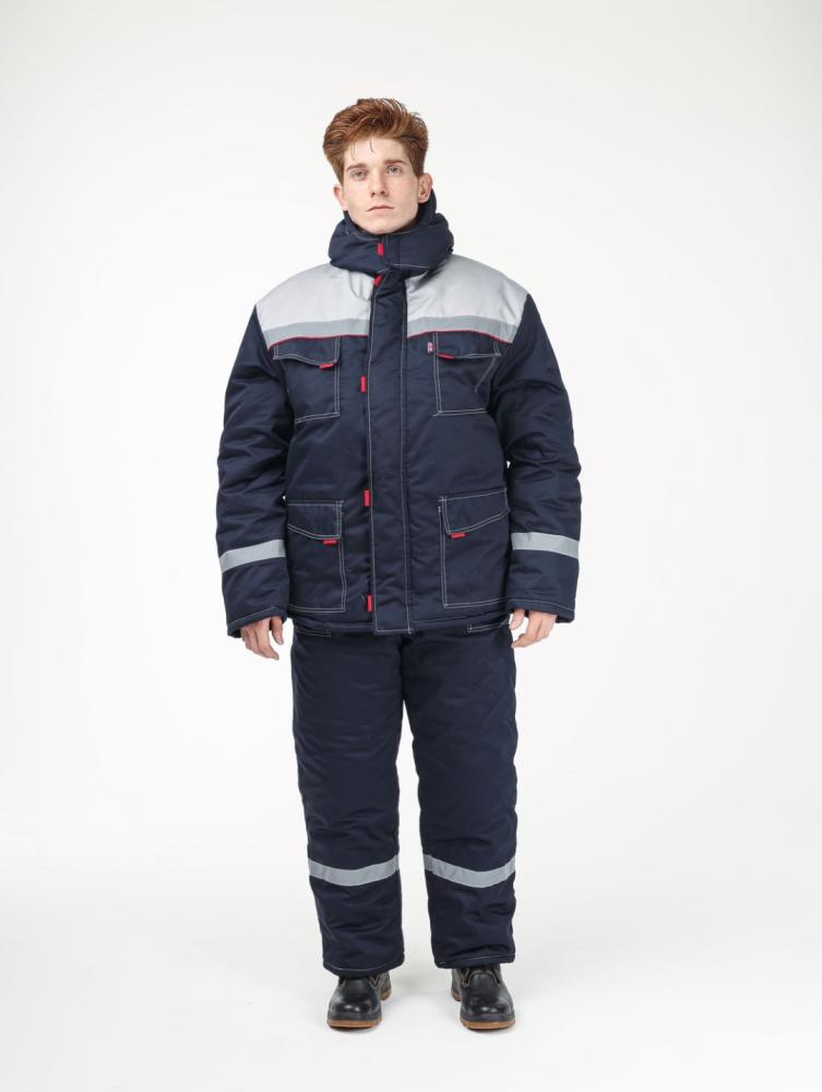 Костюм: куртка с брюками. Класс защиты: 2 (III климатический пояс). Куртка с центральной застежкой на "молнию" и ветрозащитной планкой, отстегивающийся капюшон; Два накладных;кармана с клапанами внизу и два нагрудных кармана. Костюм с лентой СОП 50 мм на груди, на рукавах, спинке и по низу на брюках. Карманы и центральная застежка с отделкой из контрастной ткани. Цвет темно синий с серой кокеткой