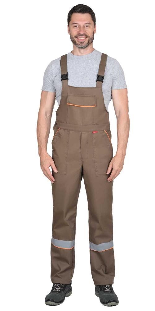 Полукомбинезон прямого силуэта, с застежкой на пуговицы спереди (гульфик) и в правом боковом шве. Сзади полукомбинезон по талии частично стянут резинкой для лучшего прилегания по фигуре. Полукомбинезон спереди с боковыми карманами и нагрудным карманом с клапаном, сзади с двойным карманом для инструментов у правого бокового шва на уровне колена. Полукомбинезон с бретелями с резинкой, длина бретелей регулируется застежкой-фастексом.