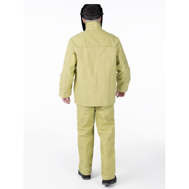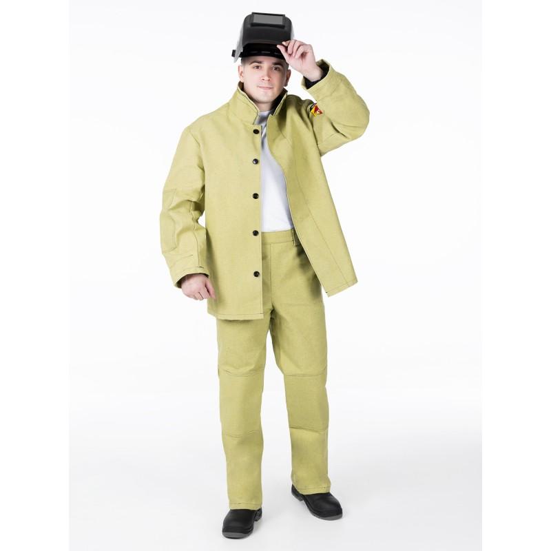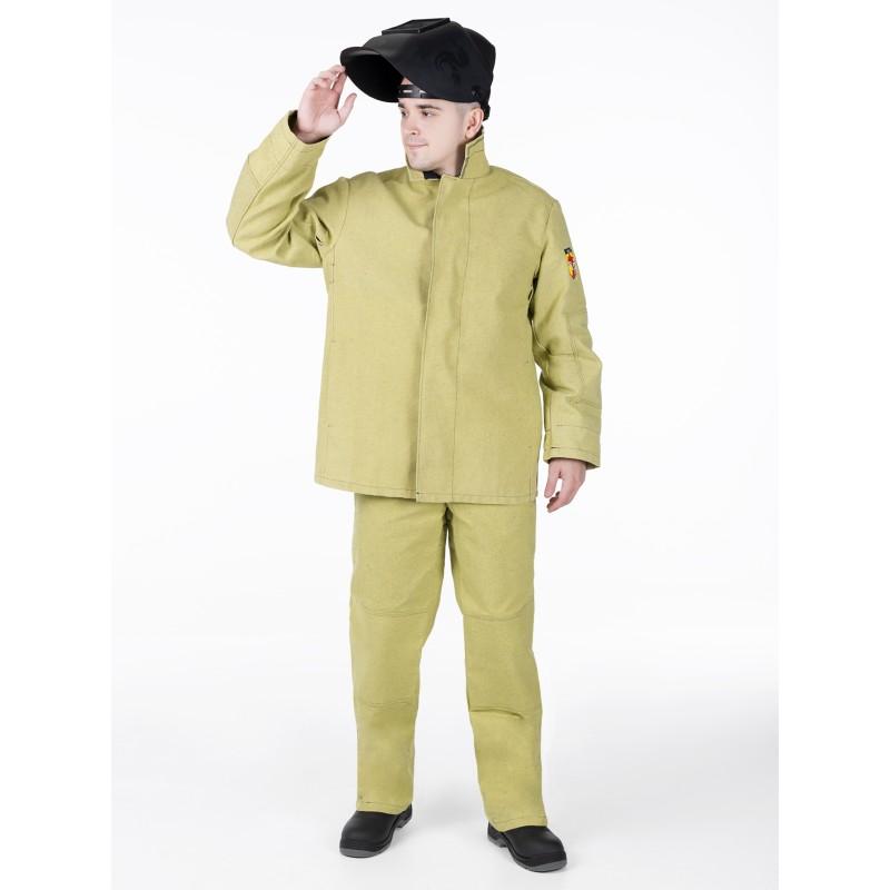 Брезент с ОП пропиткой, пов. пл.500 г/кв.м., цвет: хаки. Куртка с потайной застёжкой на пуговицы, каманами в боковых швах. Воротник отделан бязью. На кокетке спинки и под проймами рукавов-вентиляционные отверстия для воздухообмена. Брюки с застежкой на пуговицы в боковых швах. Костюм усилен дополнительными накладками в области локтей и колен. ГОСТ 12.4.250-2013